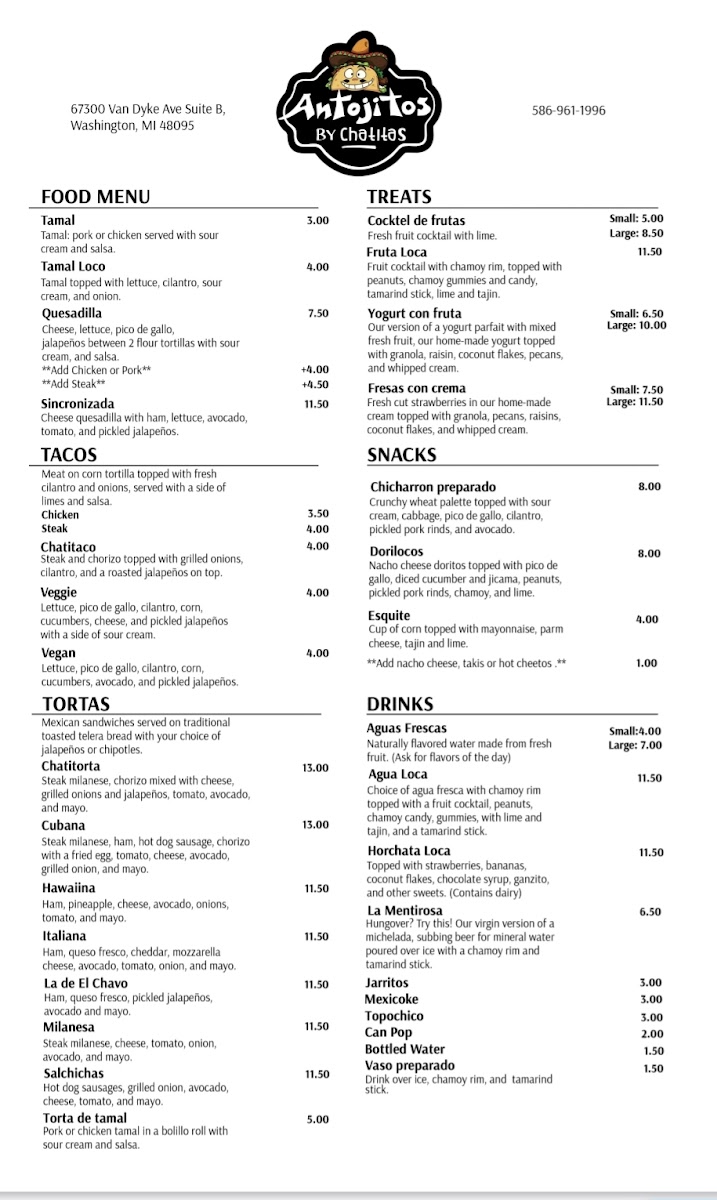 Antojitos by Chatitas offers a straightforward, comforting menu that captures the essence of authentic Mexican flavors in a casual setting. The menu focuses on familiar favorites like tacos and fresh treats, alongside refreshing drinks that complement the warm, inviting atmosphere.